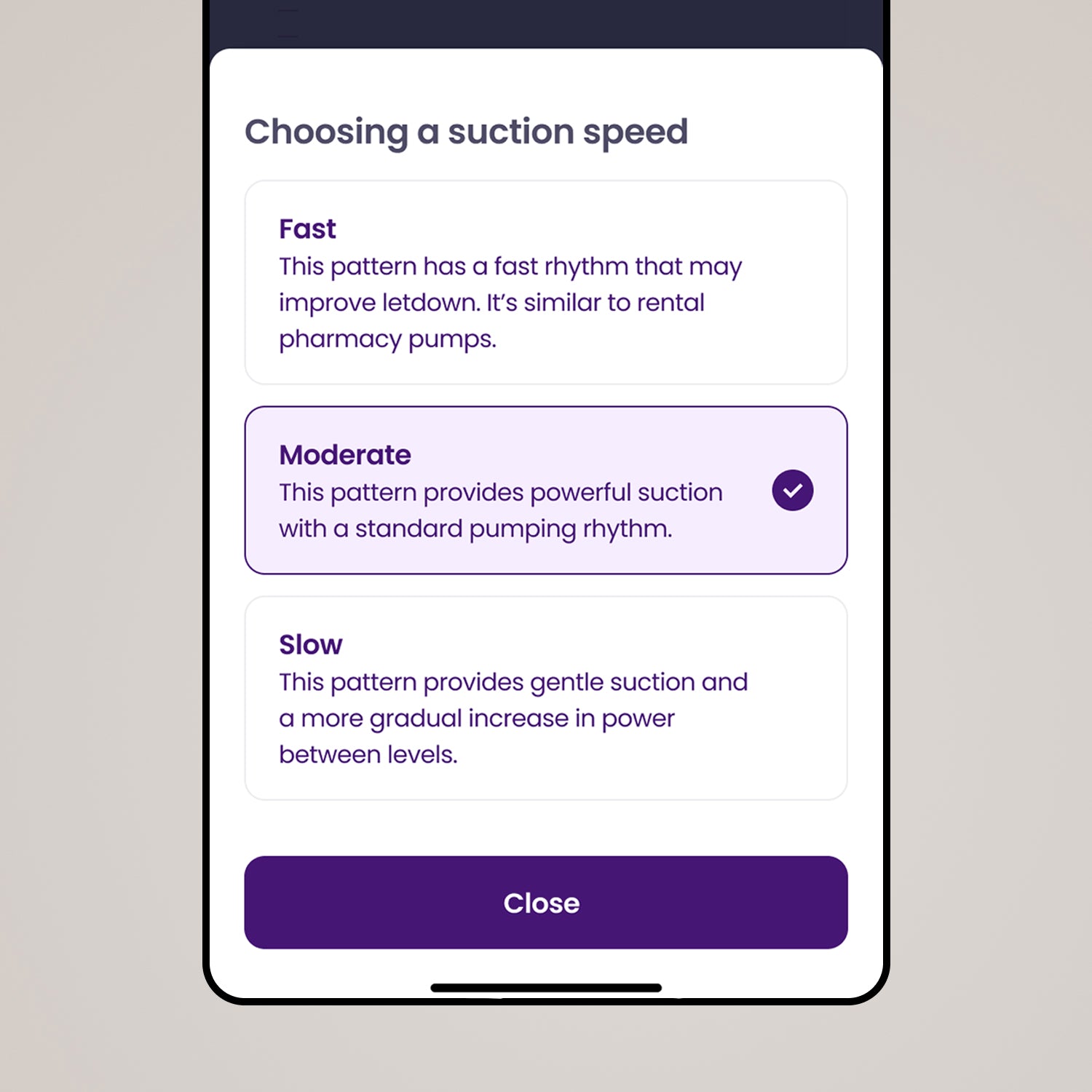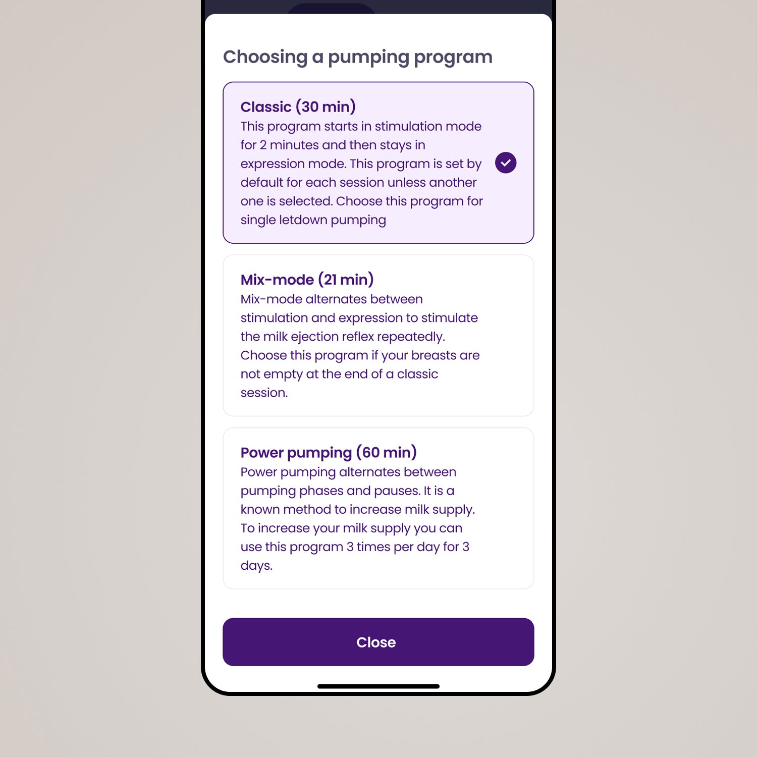 Optimize your sessions by choosing the breastfeeding program that best suits your pumping goals.
